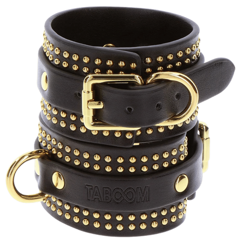 Discover the epitome of elegance and sensuality with these TABOOM Wrist Cuffs. Designed for everyone who seeks to embrace the world of bondage and BDSM with flair, these cuffs are the perfect blend of allure and sophistication. Sleek black with opulent gold-studded details, these wrist cuffs exude an aura of luxury that is simply irresistible. The striking contrast of colours not only adds a touch of glamour but also emphasizes the power and passion that comes with exploring your desires. Offering a secure and adjustable fit to accommodate various wrist sizes, ensuring a satisfying experience for all. Embrace the art of bondage in a way that epitomizes grace and allure with these TABOOM Wrist Cuffs.